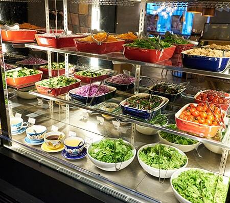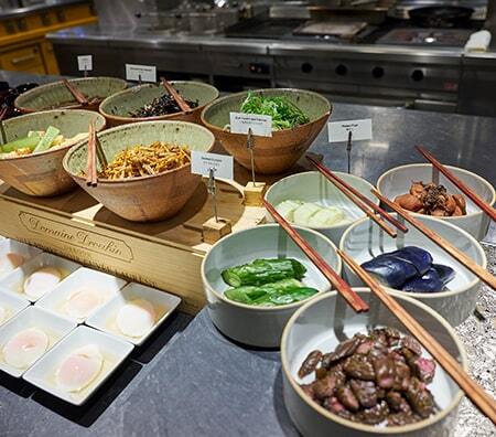 ダーワ・悠洛 京都の朝食は、竹林とオープンキッチンが絶妙にマッチするGrill 54thで提供される。地下一階でエレベーターの扉が開くと、品数豊富なビュッフェメニューとオープンキッチンで活き活きと食事を作るシェフの姿が目に飛び込んでくる。そして、吹き抜け空間に竹林の中庭が配されたレストランは、思わず写真を撮りたくなるセンスあふれる空間。和食、洋食の豊富なメニューを好きなだけ盛り付けて、自分だけの一皿を楽しめる魅力満載なモーニングビュッフェを!
